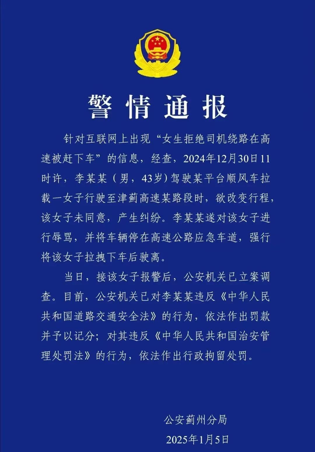 近日,有网民称,自己在乘坐某平台顺风车时,被司机在高速路上赶下车。该网民告诉记者,司机将她拖拽下车时致其脚踝受伤。天津市公安局蓟州分局1月5日晚间发布警情通报,司机李某某被行拘。(平安蓟州、央广网)